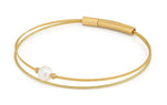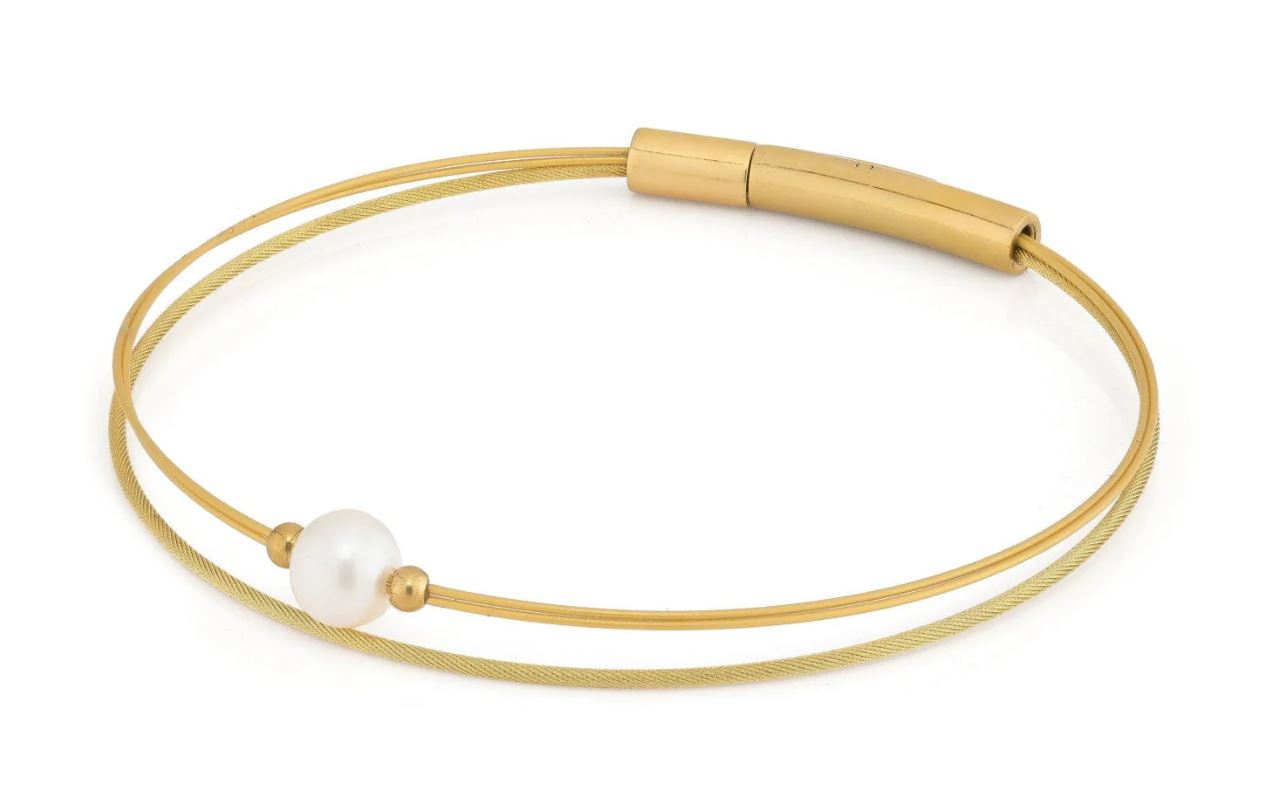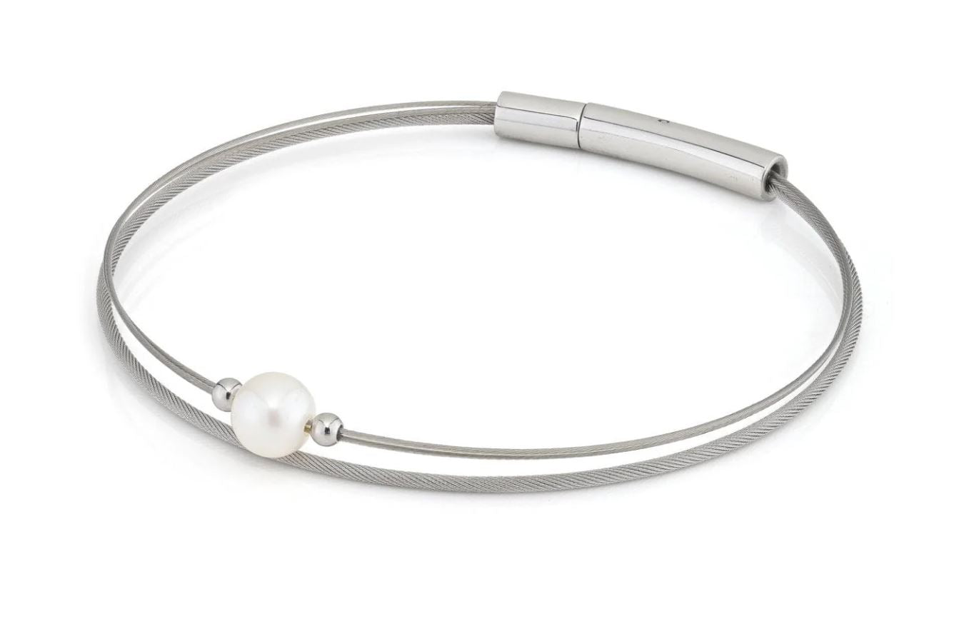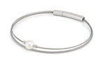 Armband aus flexiblen Drähten mit einer kleinen Perle und zwei silbernen Edelstahlkugeln. und Bajonettverschluss.